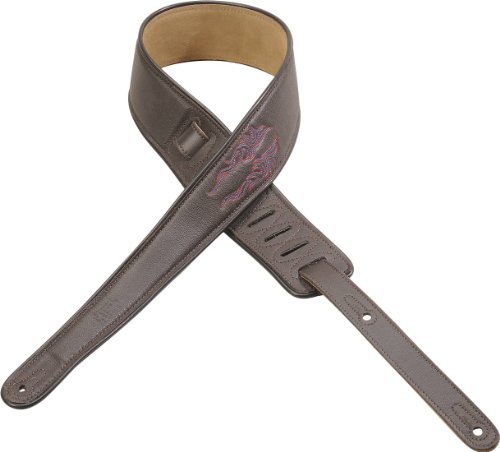 Levy's Leathers Guitar Strap MG62E01-DBR 2 1/2" tapering to 1" garment leather acoustic guitar strap with decorative multi-colored embroidery, foam padding, and suede backing. Reviews